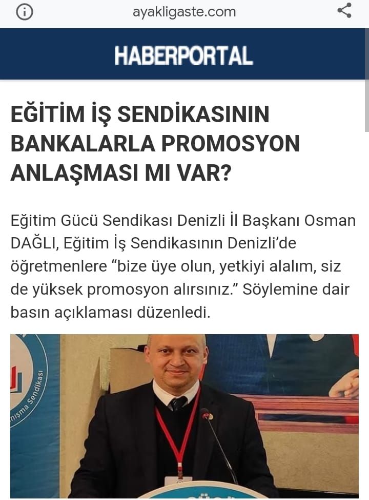 Eğitim Gücü Sendikası Denizli İl Başkanı Osman DAĞLI, Eğitim İş Sendikasının Denizli’de öğretmenlere “bize üye olun, yetkiyi alalım, siz de yüksek promosyon alırsınız.” Söylemine dair basın açıklaması düzenledi.