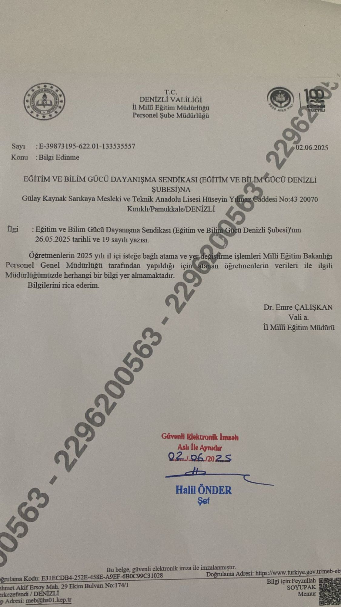İl İçi Atamalarda Oluşan Listeyi Talep Ettiğimiz Yazımıza Cevap Geldi - Duyurular