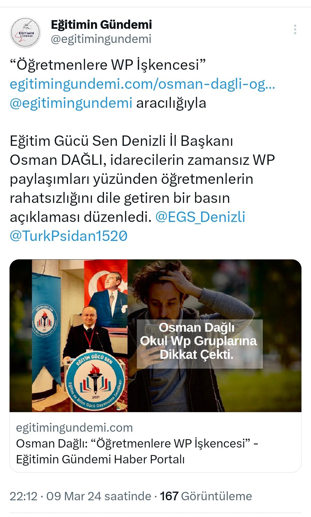 Eğitim Gücü Sendikası Denizli İl Başkanı Osman DAĞLI, idarecilerin zamansız WP paylaşımları yüzünden öğretmenlerin rahatsızlığını dile getiren bir basın açıklaması düzenledi. Dağlı, okul WP gruplarının kuralsız biçimde ve öğretmenin dinlenme saatleri dikkate alınmaksızın kullanımının sıkıntılara yol açtığına değinerek şunları kaydetti: